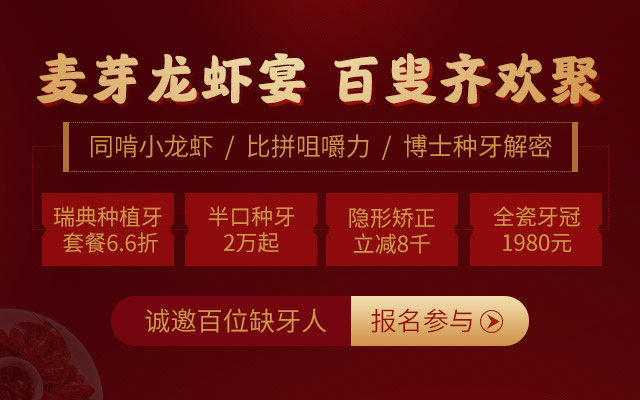 为了帮助缺牙人拥有健康好牙,吃出幸福味,麦芽口腔将在罗湖、南山、宝安三个机构同时开展“百叟龙虾宴”,诚邀百位缺牙人齐聚一堂,共享饕餮盛宴。届时活动现场不仅有味道鲜美的小龙虾,更有种植牙公开课、“工程”受益人分享种牙经、种植牙耐力小游戏等精彩环节,目前活动名额所剩无几,请市民朋友抓紧时间报名。